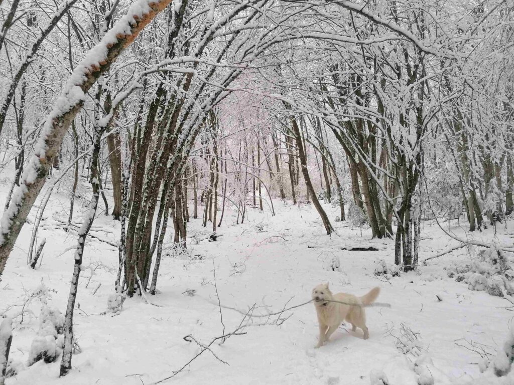In her company, I wintered this winter in a vineyard cottage among the vineyards and created, created, created … That I didn’t get carried away too far when I forget everything else – even food, drinks, going to the toilet … Tara took care of the balance. She started whining after a while, but at first I rejected her, saying: Can I have peace for at least half an hour?! before I noticed that three or four hours had already passed. For the first time in my life, I enjoyed my work, every moment of the day, doing only what made me happy, looking forward to the many gifts of nature, such as sunny mornings over the blurry Dolenjska or a white Christmas, a snowy New Year and Valentine’s Day. Every now and then a blow came, because being officially unemployed, doing ‘nothing’, is, of course, unheard of in today’s society. I wrote in the morning, spent 2-3 hours in the afternoon walking in the woods, and in the evening I lit the wood-stove – also with the branches that Tara brought from the forest, and I cut them myself (and felt very strong), 🙂 I listened/watched various podcasts or danced and sang whatever and as loud as I wanted. But for the most part, these were not popular music tunes, but healing music.