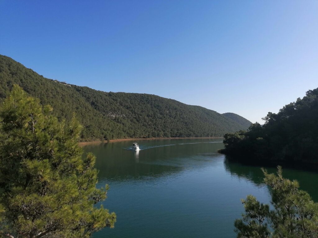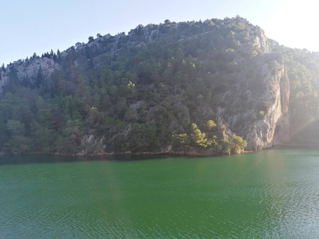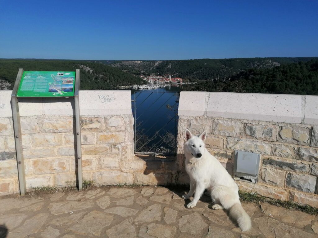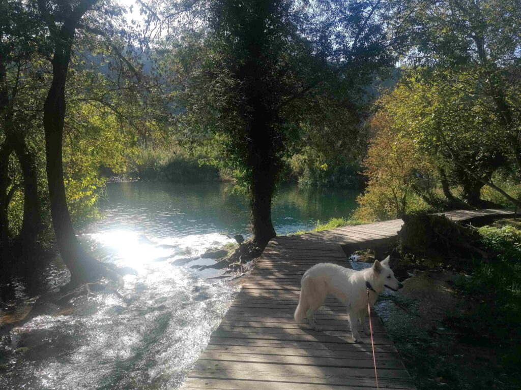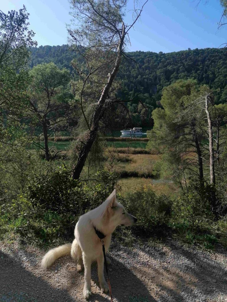 Na ladjici, ki pelje proti Skradinskemu buku naj bi bili za pse nagobčniki obvezni, a tega nisva preverjali. Slabih 4 kilometrov dolg sprehod ob reki, v kateri je kakršno koli namakanje prepovedano (tudi za ljudi), se je zdel primernejši kot gneča na ladjicah, ki sva jih opazovali s kopnega …