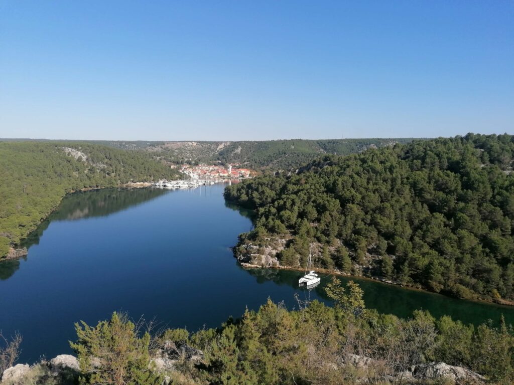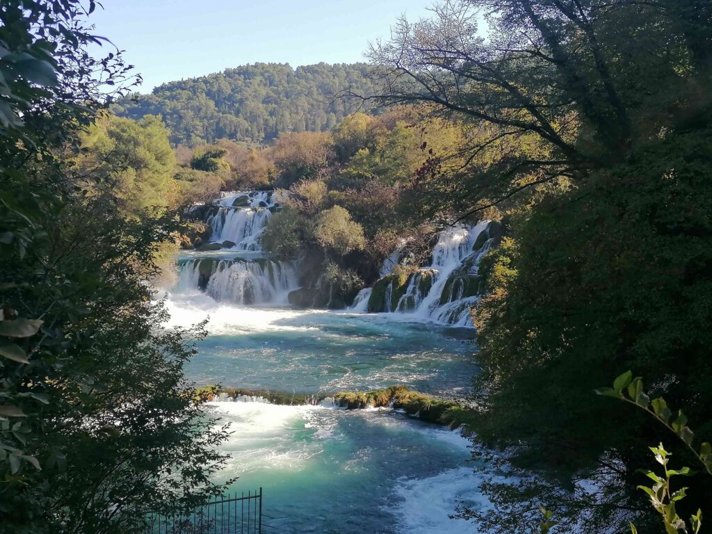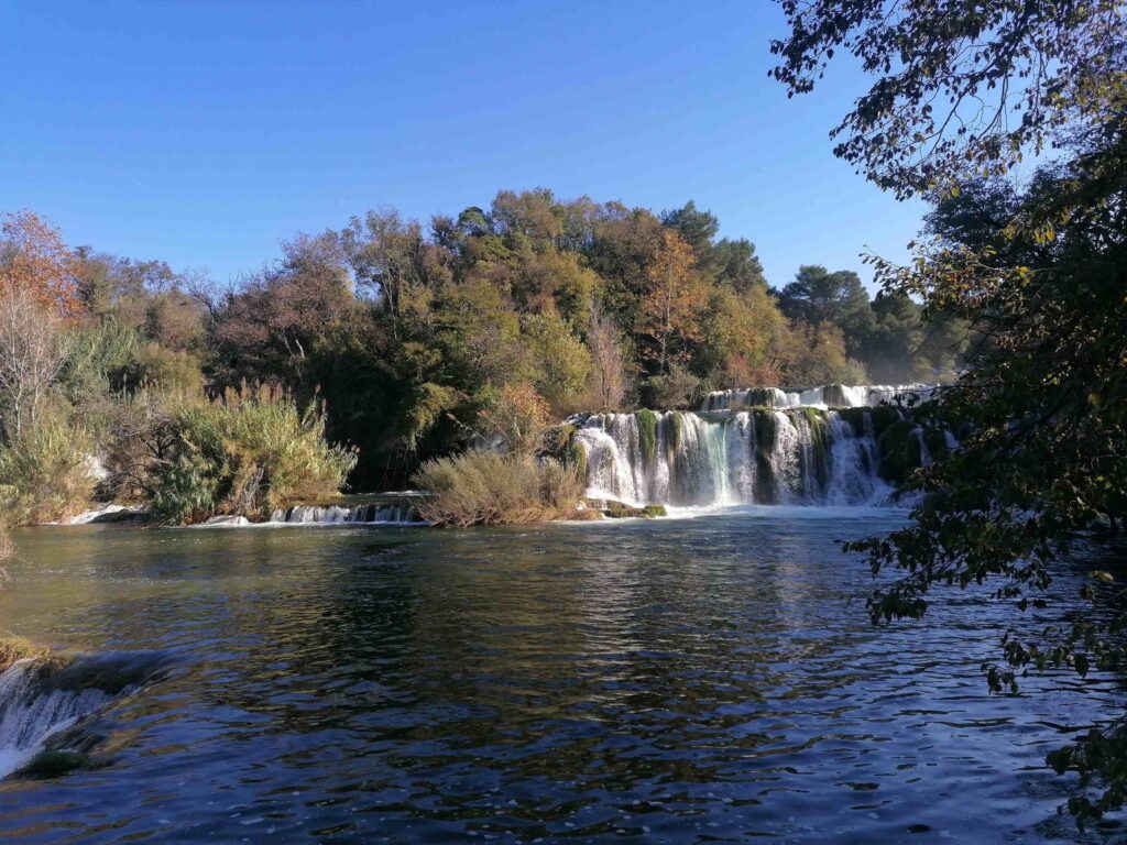 Do izhodišča v Nacionalni park Krka v Skradinu sva se zapeljali po avtocesti in bili na postajališču deležni lepega razgleda na reko in mestece Skradin. Še eno izmed najstarejših mest tega področja, ki je živelo že v časov Ilirov, njegovo središče z ozkimi tlakovanimi ulicami pa je zaščiten kulturni spomenik.